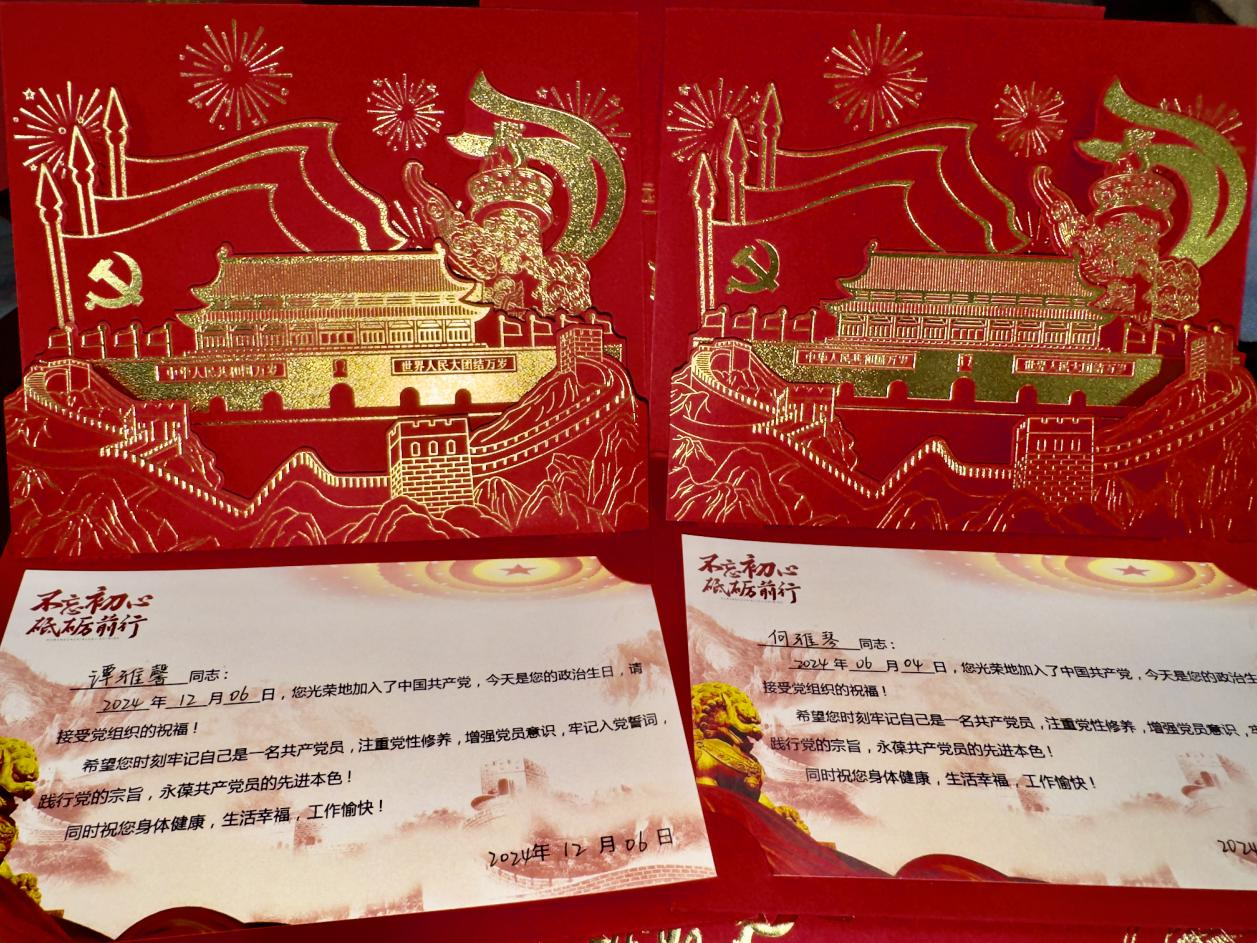 在“政治生日”贺卡赠送环节,两位学生党支部书记为本学期发展的7名学生党员送上了精心准备的“政治生日”贺卡。贺卡上不仅印有入党誓词和对党员的政治生日寄语,还记录着每位党员的入党时间。这小小的贺卡,承载着党组织对党员们的关怀与期望,成为了他们政治生命中的珍贵纪念。